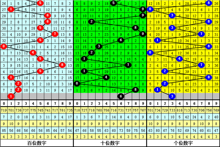 跨度分析:最近5期分别开出跨度:1、4、7、2、7,本期注意跨度走小,参考跨度5。