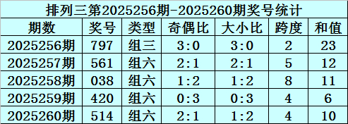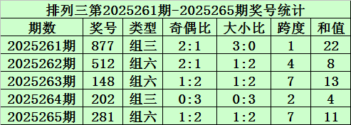上期回顾:排列三第2025265期开奖号码为281。奖号类型为组六,奇偶比为1:2,大小比为1:2,跨度为7,和值为11。